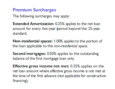 - As for current premium surcharges, they'll remain unchanged in all cases. Just note, however, that CMHC never used to levy a premium surcharge for extending MLI Select amortizations beyond 25 years. Now it does. So if you want a 40-year amortization, that's another 75 bps on top of the MLI Select premiums in the above table.