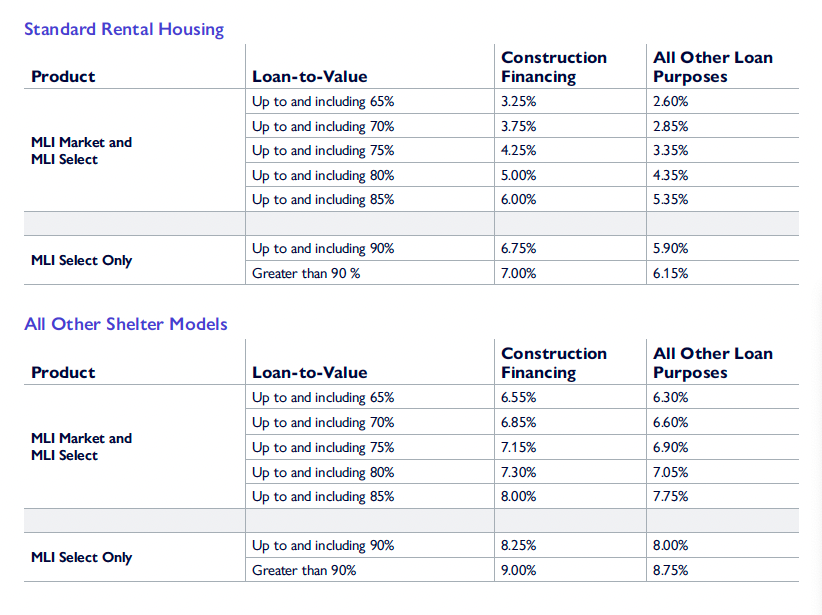 - NEW: A new premium discount schedule for MLI Select applications will take effect. The purpose: to lower premiums "based on the level of social outcomes achieved by the borrower, such as affordability, accessibility, or energy efficiency," CMHC says.