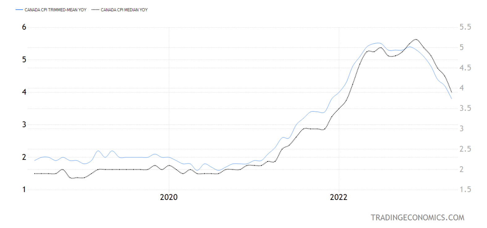 Canada's inflation rate landed precisely where the consensus thought: 3.4%. That's down 1%-point from the 4.4% print last month.