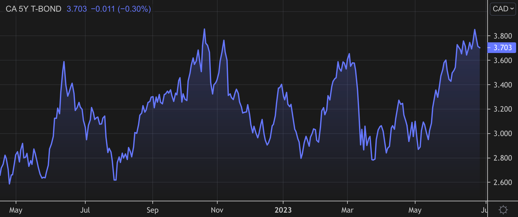 "With measures of recent price growth continuing to run above 3 ½%, it looks almost like a done deal that the Bank of Canada will raise rates another 25bps in July." - Canada's 5-year yield was down one bps as of 10:30 a.m. ET today, despite the U.S. 5-year being up five bps. If the July 7 jobs report shows worsening unemployment and we get no more hawkish developments out of the U.S. through next week, there's still a chance 2023 5-year yields could top out below last October's high.