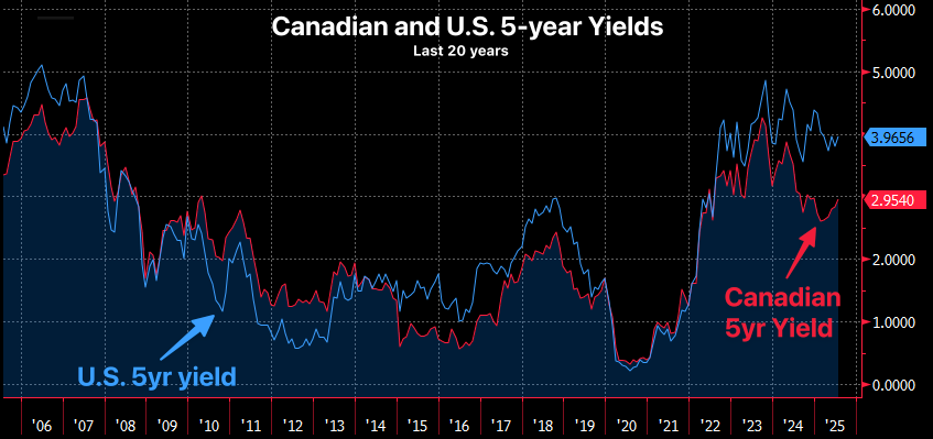 Nevertheless, the three catalysts above are mainly why U.S. and Canadian 5-year yields move in parallel over the long run. In fact, their twenty-year monthly correlation is about as strong as you'll find in economics: 0.92 (A perfect correlation = 1.00).