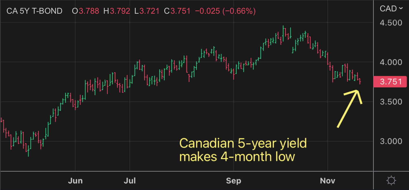 Canada's 5-year yield took the data in stride, falling just 3 bps on the day as of this writing. But it still managed to hit a low unseen since July.