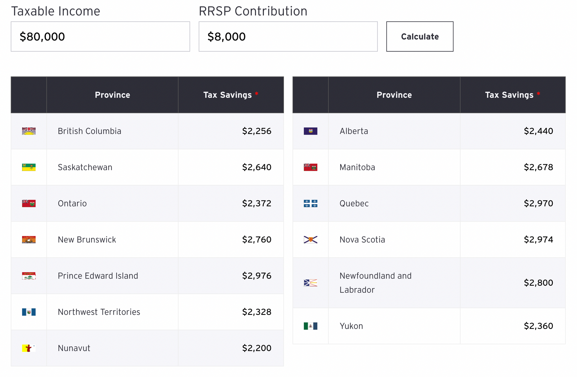Folks can get a quick and dirty idea of potential tax savings—based on their income—using this EY RRSP contribution calculator.