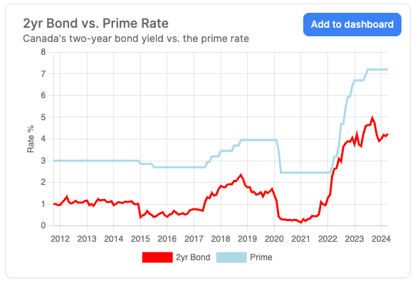 - Make a large chart title that says “2yr Bond vs. Prime Rate” and then show a subtitle right below it that says “Canada's two-year bond yield vs. the prime rate”.