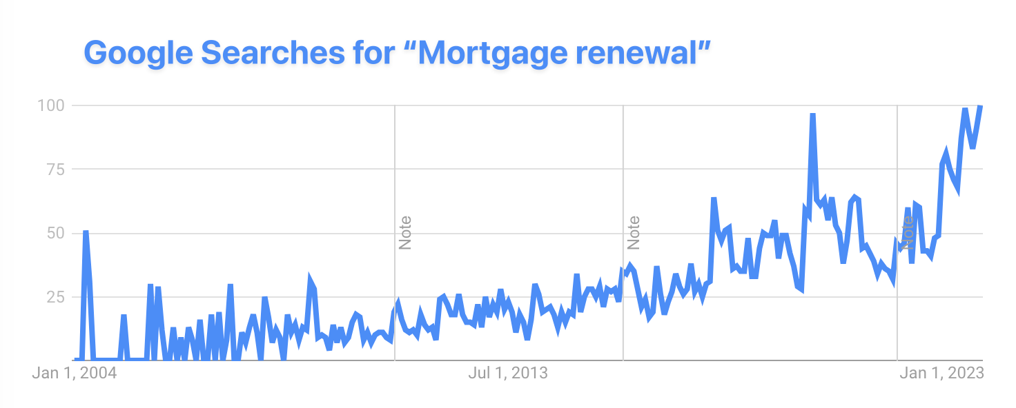 Calling mortgage renewal risk a "hot topic" is like calling the Grand Canyon a nice ditch, quite an understatement. Mortgage renewal chatter is hitting a level of buzz we haven't seen in decades, as the Google Trends chart below documents.