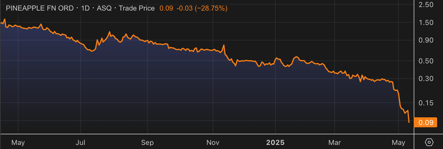 Canada's fruity-named brokerage network, Pineapple Financial (ticker: PAPL), has lost about 96% of its stock value since its IPO.