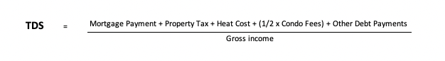 A borrower's TDS ratio equals his/her total monthly obligations divided by total gross monthly income. In other words, it's the percentage of income needed to cover all debt payments.