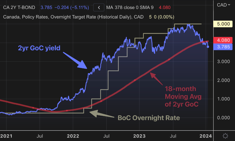 To some, technical analysis might seem like financial voodoo, but history doesn't lie. When the 2-year yield undershoots its 18-month moving average without a significant bounce, that's historically been a harbinger of BoC cuts within three to twelve months.