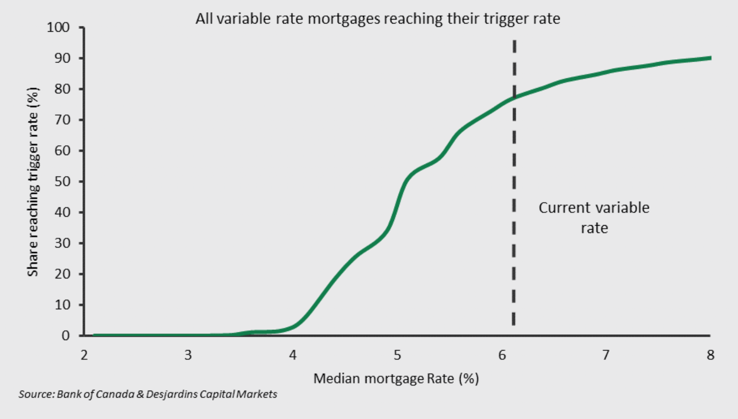 Trigger risk fades: Of the 1 in 3 mortgages with floating rates, about 75-80% have fixed payments, and about "three-quarters" of fixed-payment variables have hit their trigger rate, estimates Desjardins Economics. The BoC's pause has eased trigger rate concerns, but if rates do resume higher "a number of financial institutions have disclosed that they will allow the principal owed to grow to 105% of the original loan value before requiring any additional payments," Desjardins said Monday. "That’s a high bar to exceed," it added, and leaving the policy rate on hold through 2024 would not see any mortgages breach that threshold."