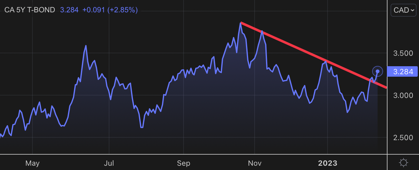 Today's gains 10x'd Bay Street expectations of 15,000 jobs, sending Canada's 5-year yield another 11 bps higher as of 12:30 p.m. ET.