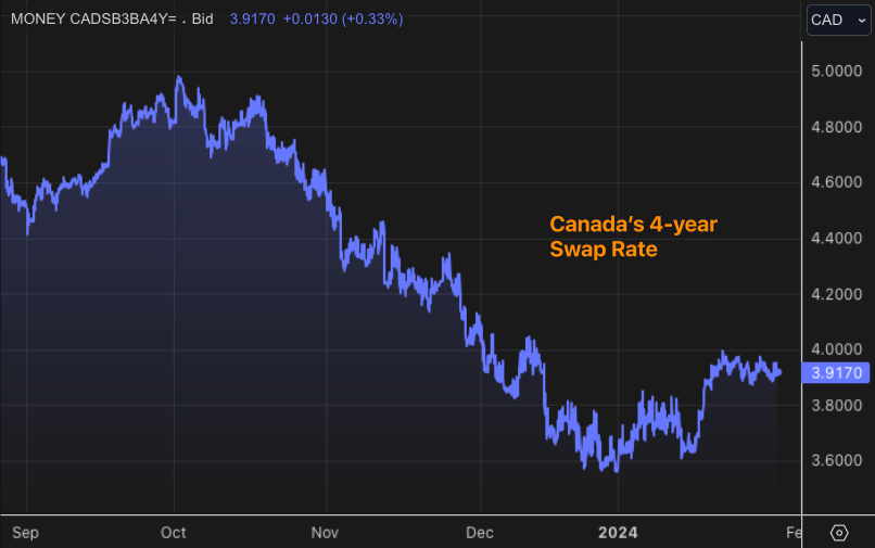 Fixed-rate funding costs have barely budged for ten days. That's visible in the 4-year swap (below), the closest thing to a fortune teller when it comes to predicting near-term uninsured fixed-rate changes.